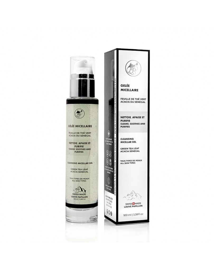 Gelée micellaire à la feuille de thé vert et acacia du Sénégal qui nettoie, apaise et purifie, pour un teint unifié et éclatant toute la journée.